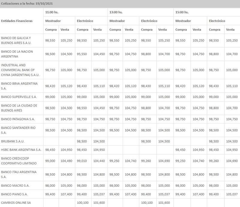 A la vez, cerró en $ 98,56 para la compra y en $ 104,87 para la venta en el promedio de las entidades financieras que releva el Banco Central (BCRA), mostrando también otro leve avance en relación al cierre previo.