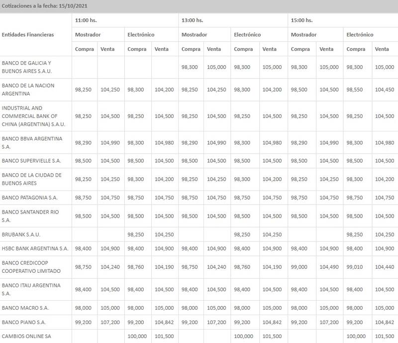 En tanto, cerró en $ 98,39 para la compra y en $ 104,69 para la venta en el promedio de las entidades financieras que releva el Banco Central (BCRA), mostrando otro leve avance en relación al cierre anterior.
