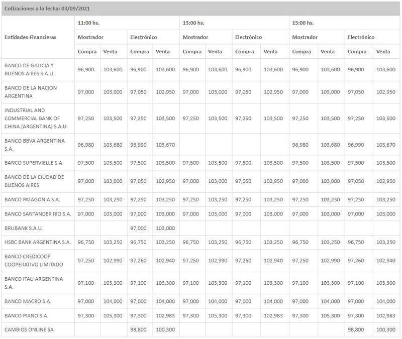 El dólar oficial minorista cerró este viernes en $ 97,01 para la compra y $ 103,32 para la venta en el promedio de las entidades financieras que releva el Banco Central. Así, el dólar "solidario" sigue en más de $ 170 en promedio.