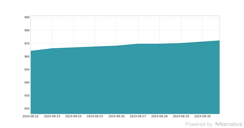 Al cierre de los mercados de este viernes, 30 de agosto de 2024, la cotización del dólar oficial a $ 972. Esta cifra demuestra una diferencia de 0% en relación a la sesión de apertura.