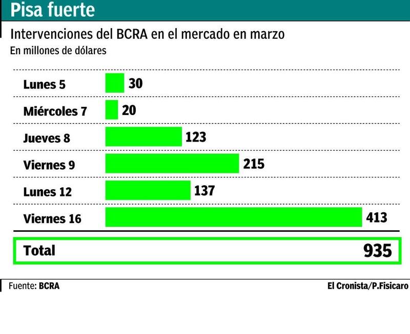 Desde el 5 de marzo la autoridad monetaria se desprendió de u$s 935 millones, para mantener controlado al dólar. Fueron seis las ruedas en las que intervino. El primer lunes del mes volcó u$s 30 millones para tranquilizar al mercado; dos días más tarde otros u$s 20 millones, pero para el fin de esa semana sumó unos u$s 388 millones. La semana pasada, en tanto, totalizó ventas por u$s 550 millones, con sólo dos participaciones.