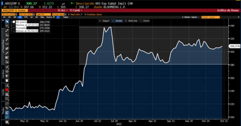 Desde mediados de septiembre, el tipo de cambio implícito en los activos financieros mostró cierta estabilidad, lateralizando entre los $ 300-315 y mostrando un nivel de volatilidad alineado con el de las principales monedas de la región.