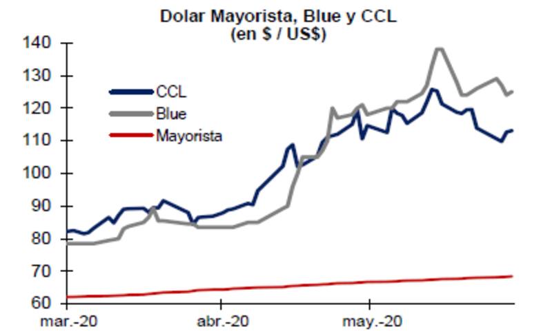 La mayor cantidad de pesos, combinada con la mayor perdida de dólares hace que el mercado ajuste por precio y que el tipo de cambio se dispare. Por ello es que el dólar paso desde el inicio de la cuarentena de niveles de $ 80 hasta niveles superiores a los $120. La brecha alcanzó el 85% y superó el máximo registrado en la era del cepo kirchnerista anterior. Por tal dinámica, el BCRA incrementó los controles cambiarios y ajustó más el cepo al dólar.