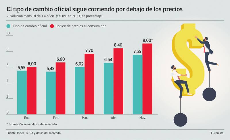 El avance del 7,55% del dólar oficial en mayo significó una aceleración respecto a los meses previos, en línea con la escalada inflacionaria, con el objetivo de evitar un mayor atraso. Fue de un punto porcentual por encima de la suba de abril (6,54%) y aún mayor respecto a las de marzo (6,02%), febrero (5,43%) y enero (5,55%).
