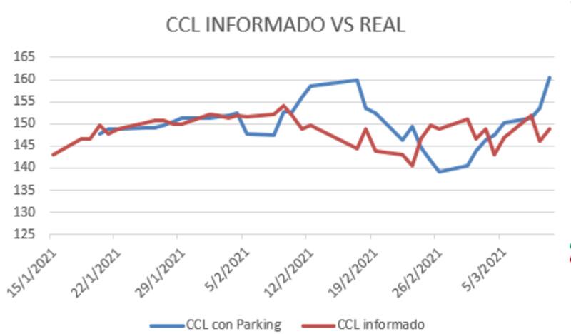 "El CCL informado es el que surge de dividir la cotización en pesos por su especie C mientras que el "contado con liquidación con parking" es el que se compra hoy y no se sabe a qué precio se va a terminar vendiendo tres días después.