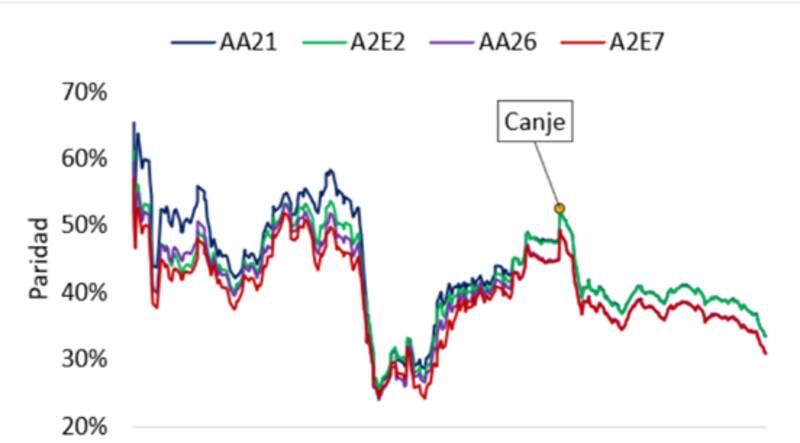 El mejor momento de paridad lo tuvieron inmediatamente después de efectivizarse el canje de los bonos reestructurados. Desde entonces, las mismas colapsaron desde valores por encima de 50% hasta los actuales 30 por ciento.