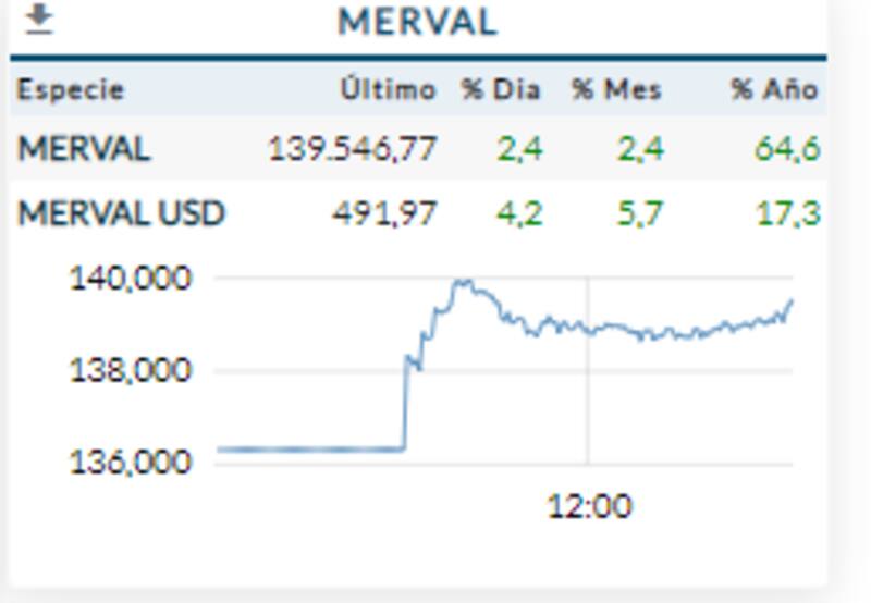 El S&P Merval opera el lunes con subas de 2,4%, hasta los 139,546 puntos y operando cerca de sus máximos históricos en pesos.