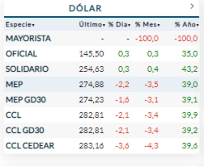 El contado con liquidación baja 2,1%, al igual que el MEP que retrocede hasta 2,2%, operando en $ 282 y $ 274 respectivamente.