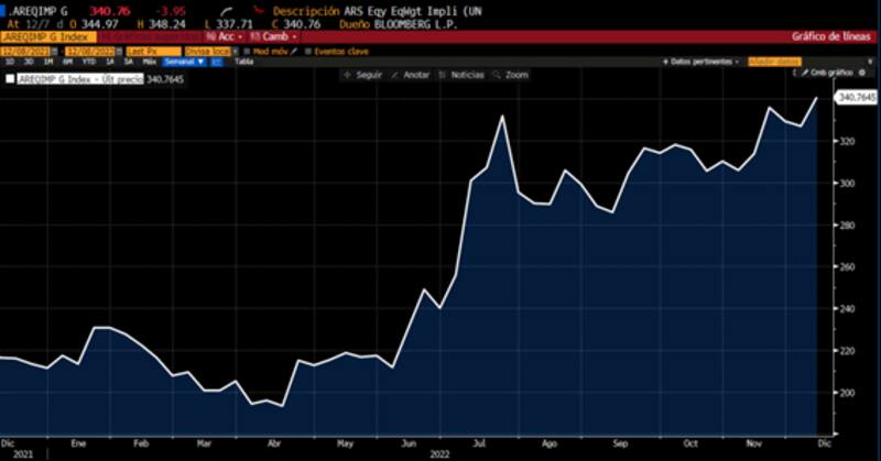 "El objetivo para el CCL se obtiene a partir de las reservas en dólares del BCRA y el stock de pasivos en pesos. Al estimar las reservas en dólares y los pasivos en pesos para fin de diciembre e incorporar los efectos del programa "dólar soja", dicho ejercicio nos arroja un benchmark de CCL de $ 410 para fin de mes", dijeron desde Grupo IEB.