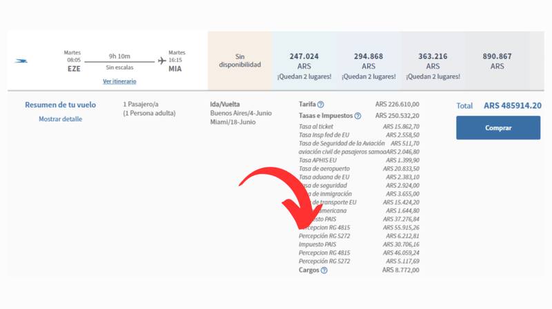 A la hora comprar, por ejemplo, un pasaje de avión para el exterior, se sigue aplicando sin modificaciones tanto el impuesto PAIS, de 30%, como la percepción de 45% del impuesto a las Ganancias.