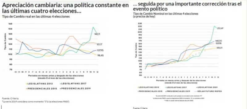 "En las cuatro elecciones anteriores, esa corrección comenzó dentro de los dos meses siguientes. El tipo de cambio nominal tuvo depreciaciones significativas (incluso superiores al 50%) en lapsos muy cortos. De este modo, queda reflejado que los desequilibrios acumulados en la antesala de los comicios tienden, por registro histórico, a descomprimirse una vez realizado el evento", alertaron desde Criteria.