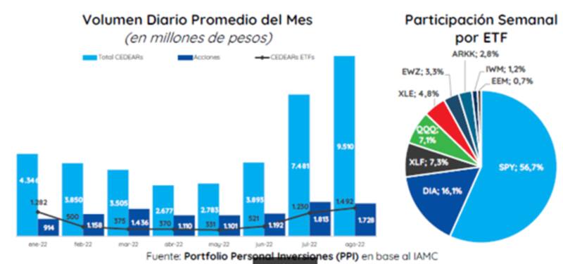 La participación que tienen los ETF en el volumen total de operaciones de Cedear también apuntó al alza, en mayo se operaron $ 331 millones y pasaron en agosto hasta los $ 1492 millones, es decir, un salto de 350 por ciento.