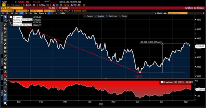 Si se observa la dinámica del mercado americano, el S&P500 llegó a caer más del 20% en junio y desde entonces se recuperó un 17% hasta los valores actuales. De esta manera, acumula una baja en lo que va del año del 12 por ciento.