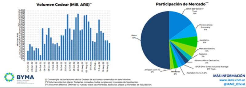 Es decir, en agosto el volumen es un 27% mayor que el de julio. Si se lo compara con el piso de mayo, el total negociado en Cedear este mes es un 241% mayor.