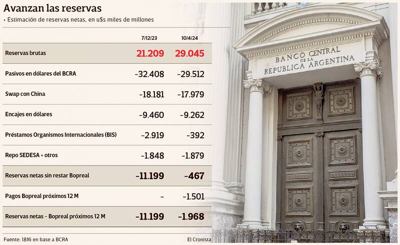 El equipo de 1816 estima que, en base a datos de hasta el miércoles, las reservas netas se ubicaban alrededor de los u$s 2000 millones negativas. El rojo se reduce si se agregan los u$s 327 millones que compró el Central en el mercado cambiario entre el jueves y viernes, pero aún estaría lejos de ubicarse en terreno positivo.