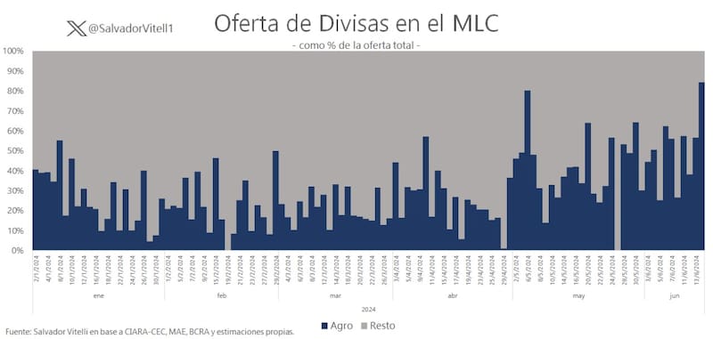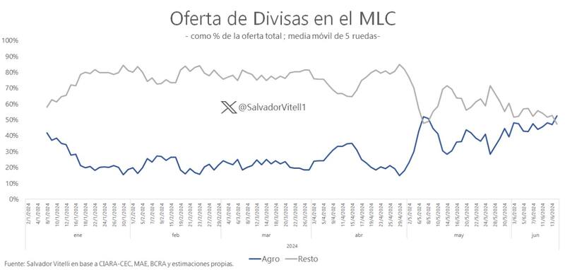 Por el lado de la oferta de dólares, más allá de las fluctuaciones, el menor flujo de ingreso de divisas al mercado oficial de cambios no está relacionado con los agroexportadores, que mantienen sus liquidaciones, sino de la fuerte caída por parte de otros sectores, de acuerdo con el economista Gabriel Caamaño.