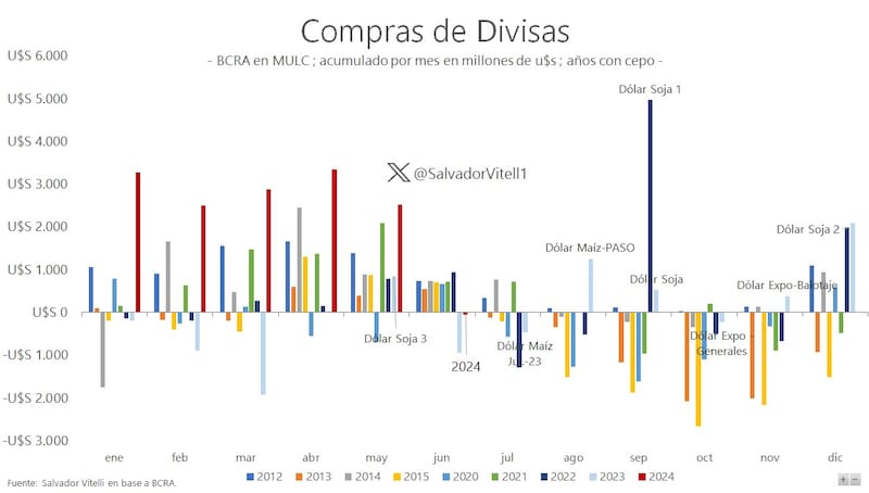 "Considerando un escenario algo optimista y con este esquema cambiario y monetario, en el segundo semestre el saldo de reservas podría ser neutro. Este escenario implicaría que aflojen con el dólar blend, cambien un poco el crawling peg, corrijan las tasas y entren divisas tras la Ley Bases", señala Pablo Repetto, de Aurum.