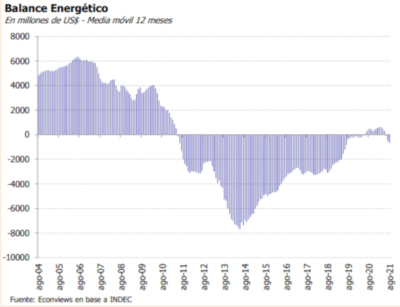"El déficit de energía de los últimos 12 meses llega a u$s 672 millones, el peor en 25 meses. No debería tardar en llegar a u$s 1000 millones. Está lejos de los u$s 7700 millones de déficit del 2014, pero es un número que empieza a pesar en la macroeconomía", consigna el estudio.