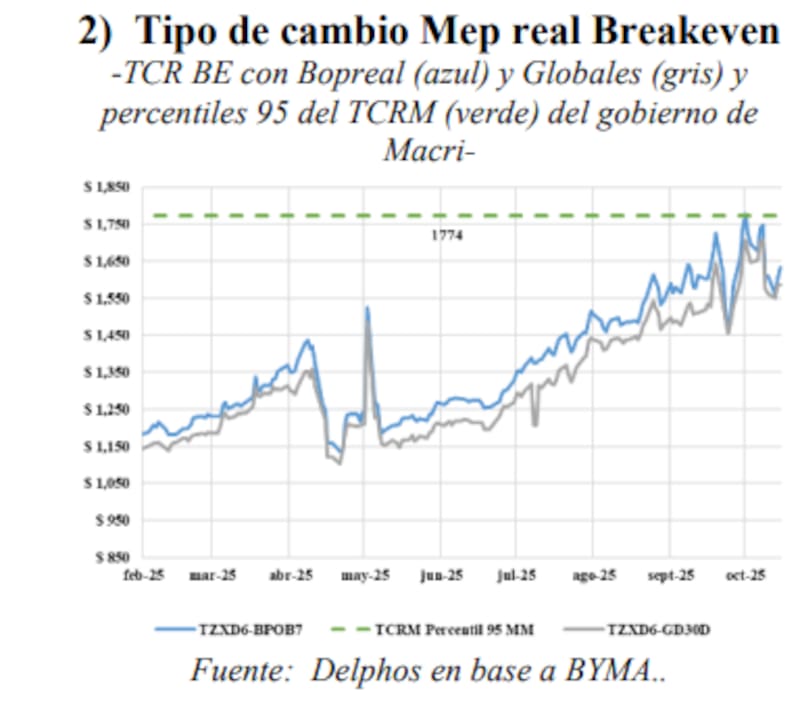 Y es que el mercado también duda respecto a la perduración del régimen de bandas, reflejada en tipos de cambio MEP break-even que superan el techo de la banda a partir de fines de noviembre.