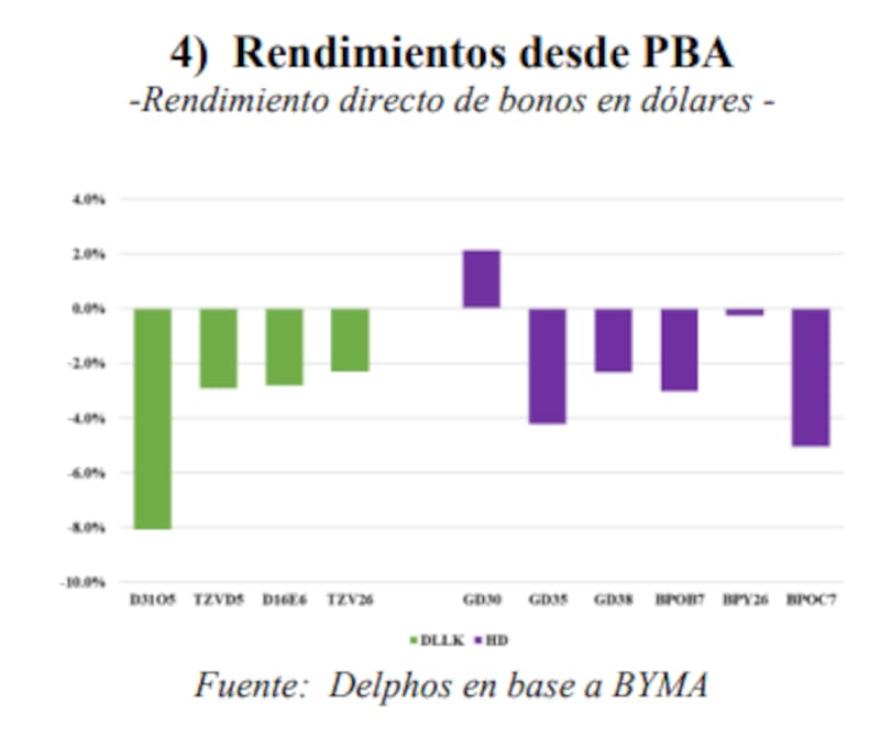 En este contexto, para Delphos, los BOPREALES cortos se posicionan como instrumentos defensivos que permiten cubrir riesgo devaluatorio con carry en moneda dura, mientras que los DLK exponen más directamente al tipo de cambio oficial y serían más sensibles a un eventual repunte de la brecha cambiaria en la antesala electoral.