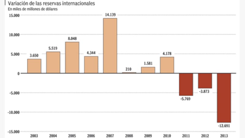 No es para menos, lo peor de 2013 fue la performance de las reservas. Las arcas de la entidad que ahora conduce Juan Carlos Fábrega cayeron u$s 12.690 millones, dejando al stock en u$s 30.600 millones para comienzos de 2014. Según datos de la consultora que dirige Roberto Lavagna, esta cifra representa el 6% del PBI y cubre sólo cuatro meses de importaciones de bienes y servicios, el menor ratio de los últimos diez años.