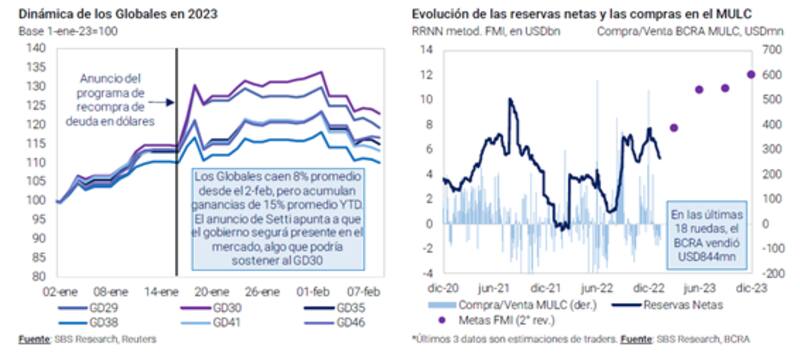 "Esto, junto a los dólares empleados en la recompra de deuda deja más lejos a la meta de reservas del primer trimestre de 2023. Por ello, según la prensa local, el equipo económico estaría negociando una recalibración de metas con el FMI, a la vez que se podría implementar un nuevo "dólar soja", dijo.