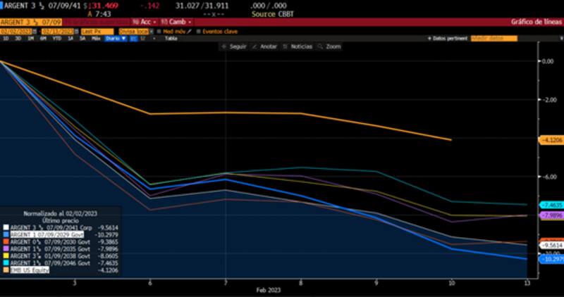 Los bonos argentinos caen entre 7,5% y 10,3% en lo que va de febrero, mientras que la deuda emergente pierde 4,3% en el mismo periodo.