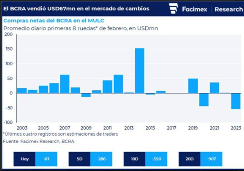 "El BCRA perderá reservas por MULC hasta mayo cuando esperemos entre con el dólar soja 3 un volumen importante, las reservas seguirán cayendo. De todas formas, estamos esperando un REPO que anuncien a más tardar en marzo. Será para cumplir metas con el FMI", comentó.