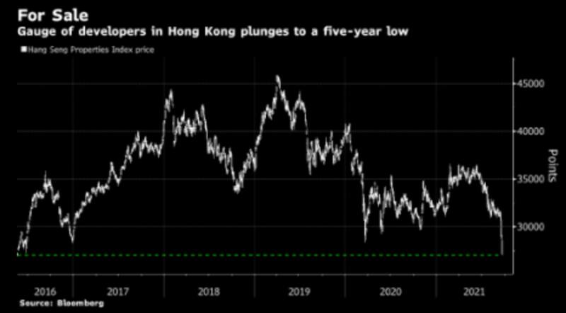 El índice Hang Seng cayó un 3,3% a su cierre más bajo desde octubre a la vez que el índice de real estate de Hang Seng se desplomó a su nivel más bajo desde 2016.