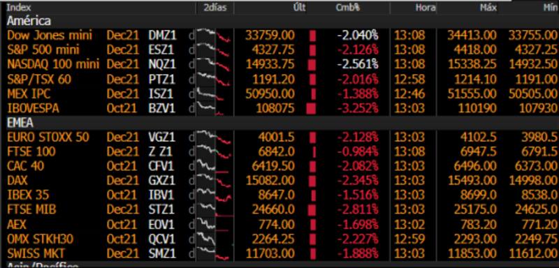 En Europa, las acciones caen más del 2% en promedio. El Stoxx600 retrocede 2,1%, mientras que el FTSEMIB de Milán cae 2,8%, similar al CAC40 de Francia y al Dax30 de Alemania, que pierden más del 2% y 2,3% respectivamente.