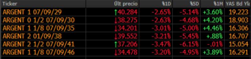 La deuda local se desploma en todos los tramos de la curva. El Global 2029 y 2030 caen 2,6% cada uno.