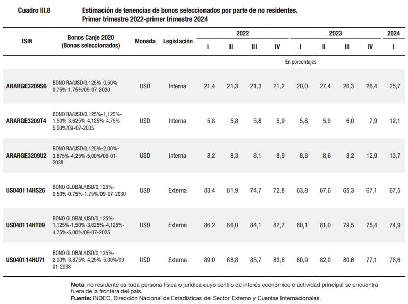 Entre los títulos de deuda denominados como Bonares (legislación local) y Globales (legislación extranjera) que releva el Indec, que vencen en los años 2030, 2035 y 2038, se observó un avance generalizado en la tenencia por parte de los inversores extranjeros. Principalmente, en los bonos que rigen por legislación local.