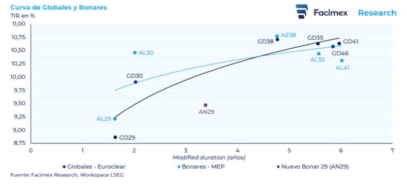 Sin embargo, explica el bróker que, cuando se observa la curva cero-cupón de los Bonares (a precios MEP), surge otra lectura: el AN29 debería haber salido con una TIR del 10,17%, es decir, 70 pbs por encima del corte de la licitación. Lejos de eso, la TIR adjudicada fue 9,47%, prácticamente calcada de la TIR de 9,49% que obtuvo Facimex al valuar el instrumento a partir de una curva cero-cupón construida con precios Euroclear ajustados por canje para los Globales.