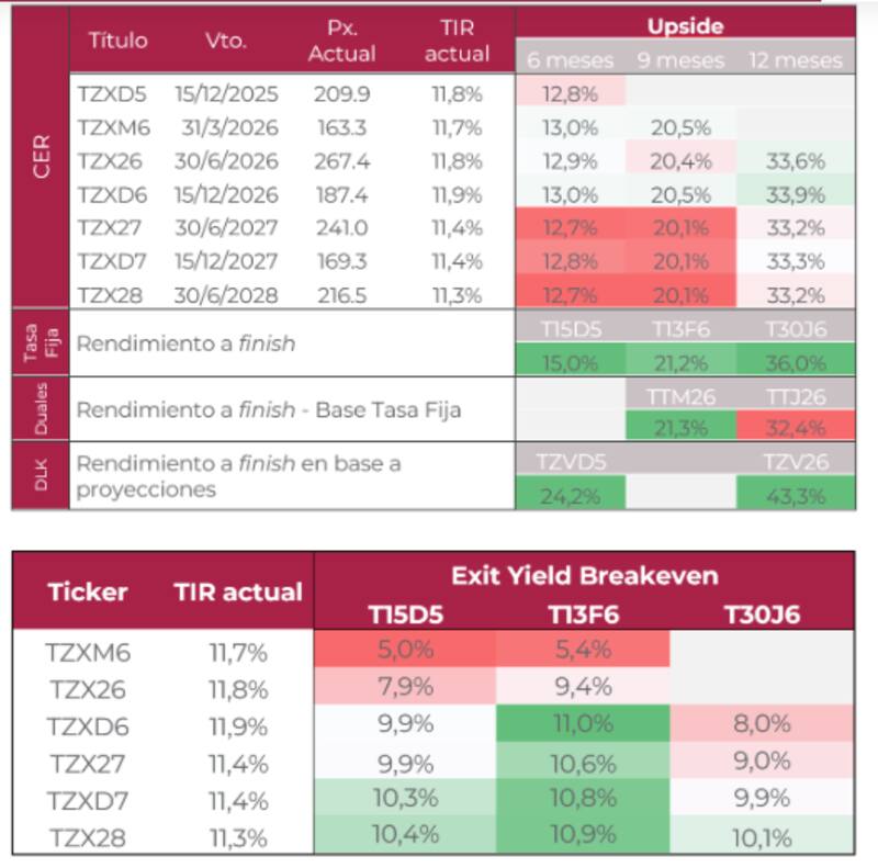 Sin embargo, agregaron que, a pesar del aumento en las tasas reales, los títulos a tasa fija y los duales siguen liderando en rendimiento."Con base en nuestras proyecciones, que contemplan un sendero de inflación a la baja hacia los próximos meses, la TIR de los CER debería comprimir 674 pb en un plazo de seis meses, 632 pb en un plazo de nueve meses y 390 pb en doce meses para igualar el rendimiento de un instrumento a tasa fija a plazos comparables. Las exigencias en cuanto a la compresión de spreads favorecen tanto los títulos a tasa fija como a los duales", indicaron.