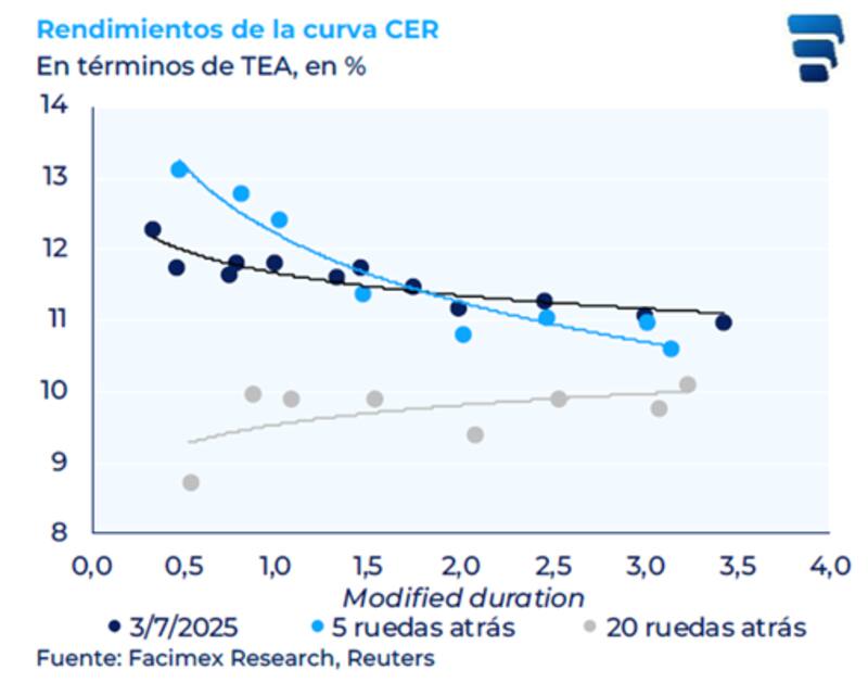 "Esto se tradujo en una marcada descompresión a lo largo de la curva CER, cuyos rendimientos pasaron de CER +10% a comienzos de junio a niveles cercanos a CER +11,5% en la actualidad", detallaron.