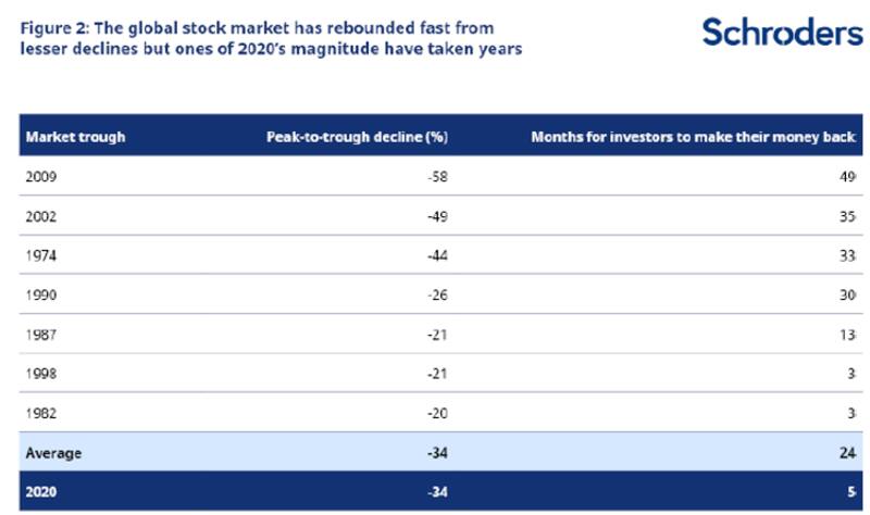 La caída fue abrupta pero también lo fue la recuperación. Cuando el mercado genera fuertes retrocesos, en general se suelen tardar años en recuperarse. Según el head de research de Schroders, en las tres ocasiones anteriores en las que el mercado cayó más de 30%, fueron necesarios casi tres años o más para recuperar las pérdidas. En promedio, una disminución del 20% de más tardó dos años en recuperarse. Para Lamont, el hecho de que el mercado se haya recuperado de una baja del 30% en solo cinco meses es algo increible.