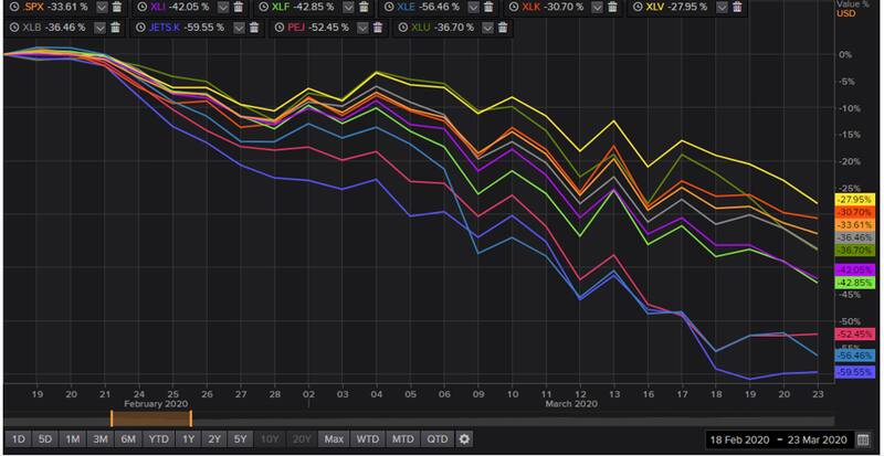 Entre febrero y marzo los principales índices accionarios de EE.UU. llegaron a caer mas de un 30%. Sin embargo, dicha baja no fue uniforme ya que se registraron caídas mucho más abruptas como en el caso del sector aerocomercial (60%) y de ocio y hotelería (52%). El sector financiero llego a bajar 43%, similar a la baja del industrial (42%).