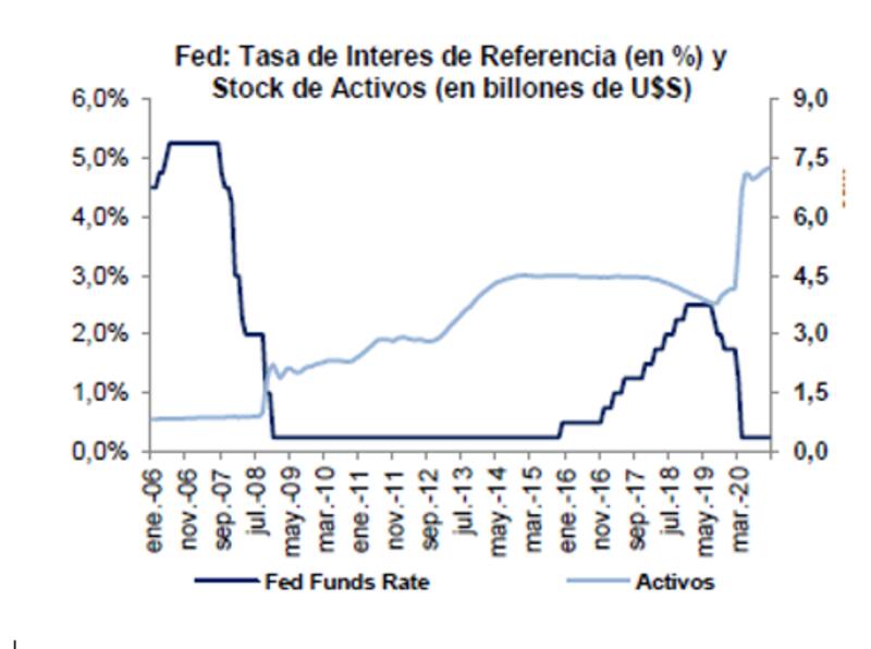 La reserva Federal puntualmente amplió su hoja de balance en u$s 3,5 billones durante la crisis, pasando de u$s 4 billones antes de la crisis a casi u$s 7,5 billones actualmente, todo ello junto con una baja de la tasa de interés al 0% prácticamente en forma directa desde el estallido de la pandemia.