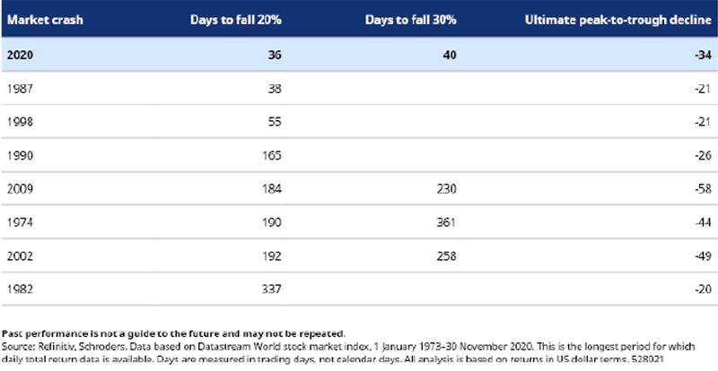 Duncan Lamont, CFA, Head of Research de Schroders remarcó que este año el mercado accionario mundial se desplomó a una velocidad récord. Si bien llegó a caer un 34% entre febrero y marzo, Lamont destaca que el mercado alcanzó una pérdida del 30% en tan solo 40 días de operaciones. Esto es más rápido que cualquier caída del mercado de valores global en al menos los últimos 48 años.