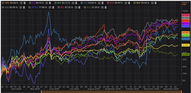 El sector de ocio y hotelería, materiales y de tecnología fueron los que más se beneficiaron, ganando más de un 85% desde finales de marzo. El sector industrial avanzó un 80%, similar a la suba del sector aerocomercial que ganó un 78% desde entonces.