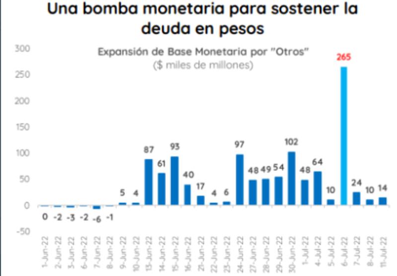 Para sostener al mercado de deuda en pesos, el BCRA emitió $1,2 billones desde junio, lo cual equivale al 1,5% de PBI y al 34%de la base monetaria promedio de mayo.