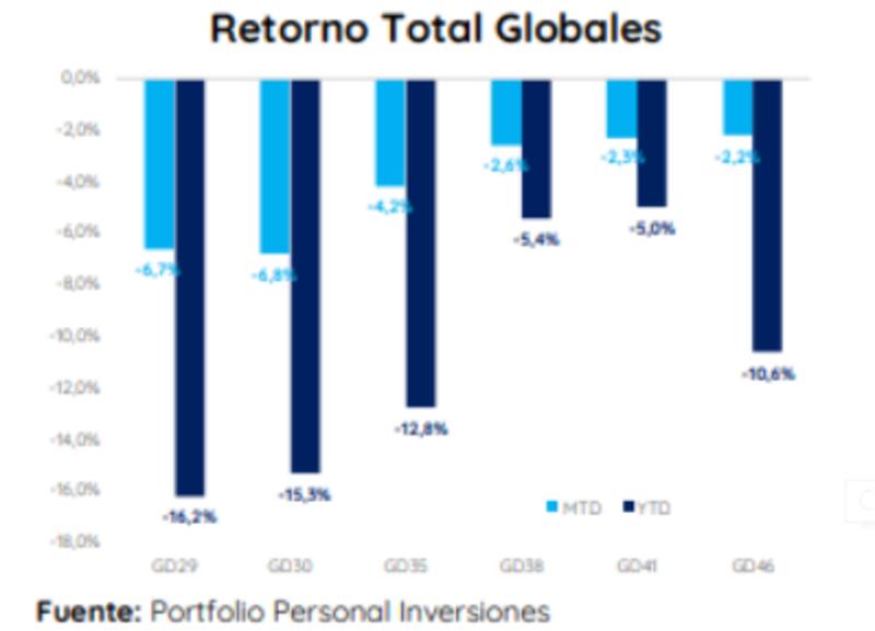 Los bonos en dólares también tuvieron un mes negativo. Todos los tramos de la curva soberana operaron a la baja, con caídas de 6,7% en el tramo corto y de 2% en el extremo más largo.
