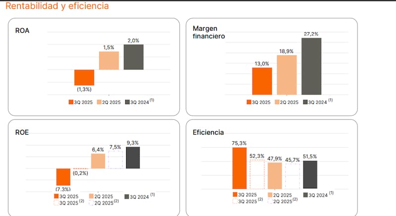 “El resultado estuvo fuertemente condicionado por la caída del margen financiero (NIM), afectado por mayores requisitos de integración de efectivo y por un incremento significativo en los cargos por incobrabilidad. En este contexto, el ROE anualizado reportado cerró en –4,7%, aunque al normalizar el impacto extraordinario de la reestructuración con HSBC, el retorno mejora apenas uno por ciento” dijo el estratega.