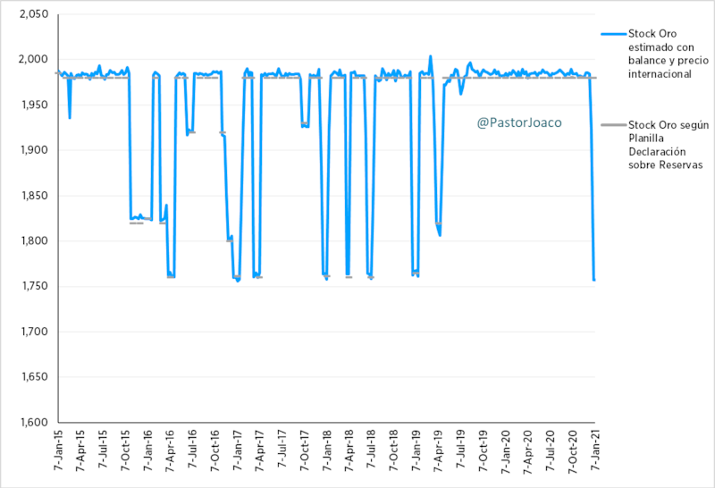 El disparador de las preocupaciones había sido un tweet del estratega de Max Capital Joaquín Pastor: "La línea oro en el balance del BCRA cayó bastante en las últimas dos semanas. El primer dato (balance al 15 de diciembre) nos pareció sospechoso, pero una golondrina no hace verano", destacó en un primer posteo.