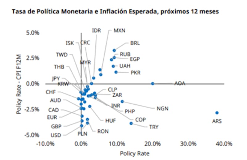 Sin embargo, la Argentina se ubica aislada en cuanto a que es el país que tiene el mayor valor (nominal) de tasa de interés de política monetaria en el registro (40%), combinado con que es uno de los que tiene la menor tasa real (neteada de inflación esperada a 12 meses).