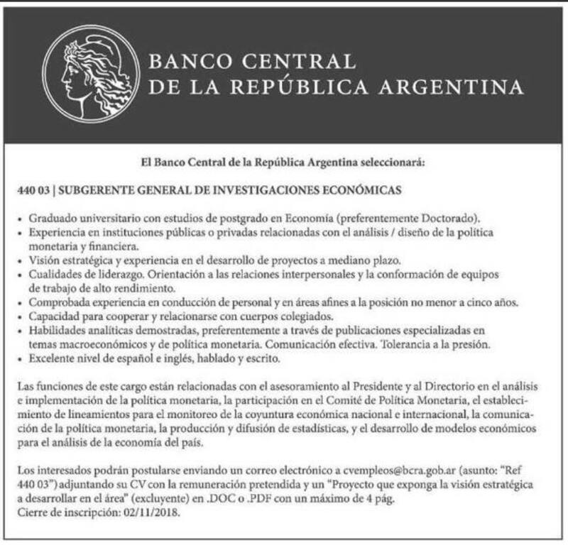 Un dato no menor es que la entidad se encuentra en la búsqueda de un economista "comunicación efectiva" y "tolerancia a la presión".
