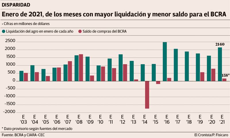 Pese a ello, el de 2021 fue uno de los meses de enero en los que el Banco Central acumuló menos divisas, con un saldo positivo que rondó los u$s 158 millones. Desde 2003, solo en cinco años la entidad cerró el primer mes del año con un saldo inferior.