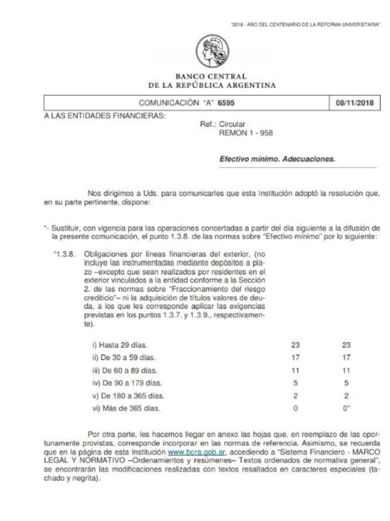 La comunicación A6595 emitida por la autoridad monetaria ayer, pero que se conoció, hoy fija nuevas normas de efectivo mínimo para las obligaciones por líneas financieras del exterior, que no incluye a las instrumentadas mediante depósitos a plazo fijo, excepto que sean realizados por residentes en el exterior vinculados a las entidades, ni la adquisición de títulos valores de deuda.