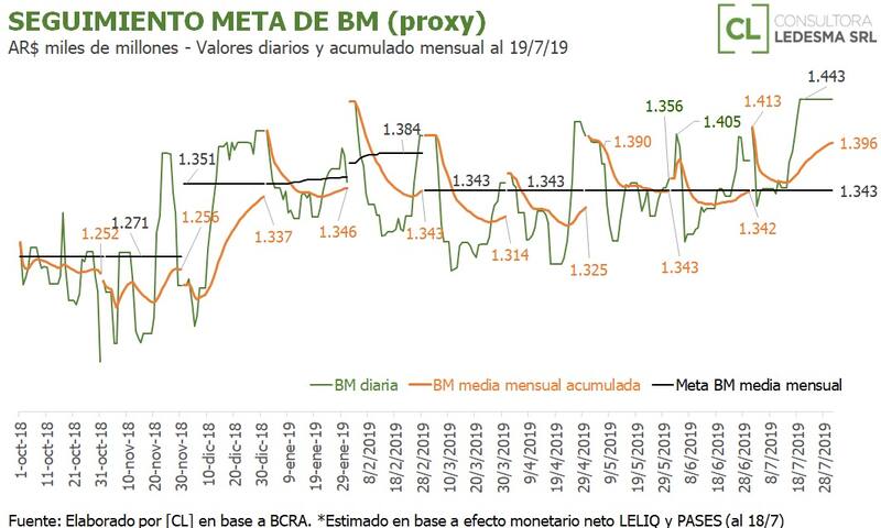 En la primera quincena de julio, el promedio de la base monetaria fue $1,353 billón y fue 0,7% superior al objetivo