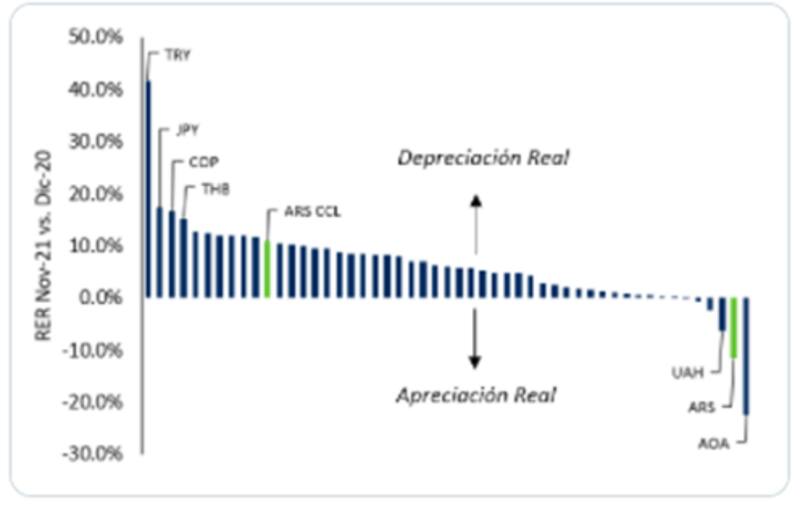 El atraso del dólar oficial se siente en la Argentina y a nivel global. Dentro de una canasta de 50 monedas de emergentes y desarrollados, en 2021, sólo cinco de ellas se apreciaron frente al dólar en términos reales.